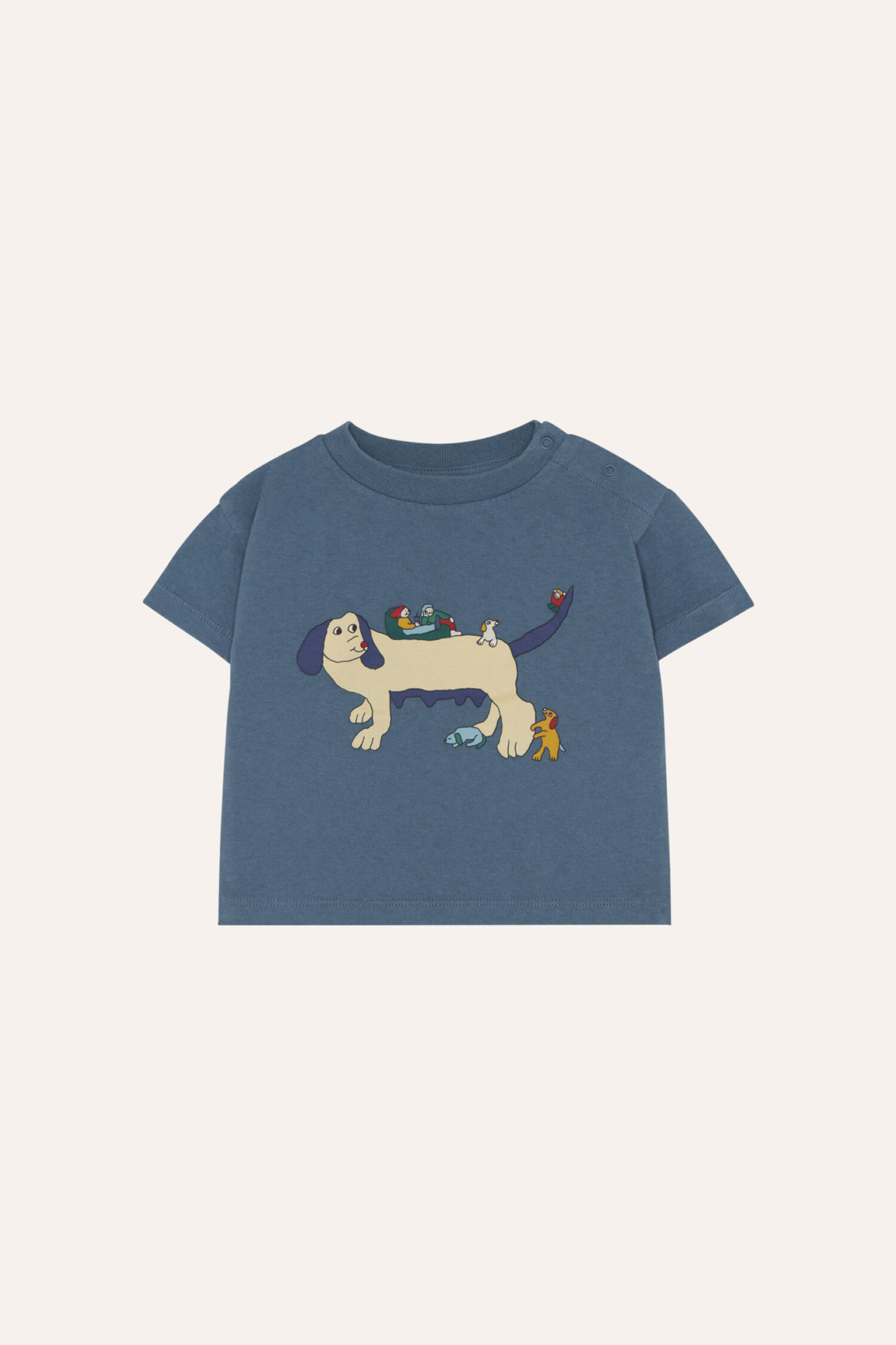 ゆったりとしたオーバーサイズフィットで、愛らしい犬たちが小さな人間を背中に乗せて遊ぶ様子をプリントしました。半袖とラウンドネックで、冬の間中着用するのに最適な衣服です。