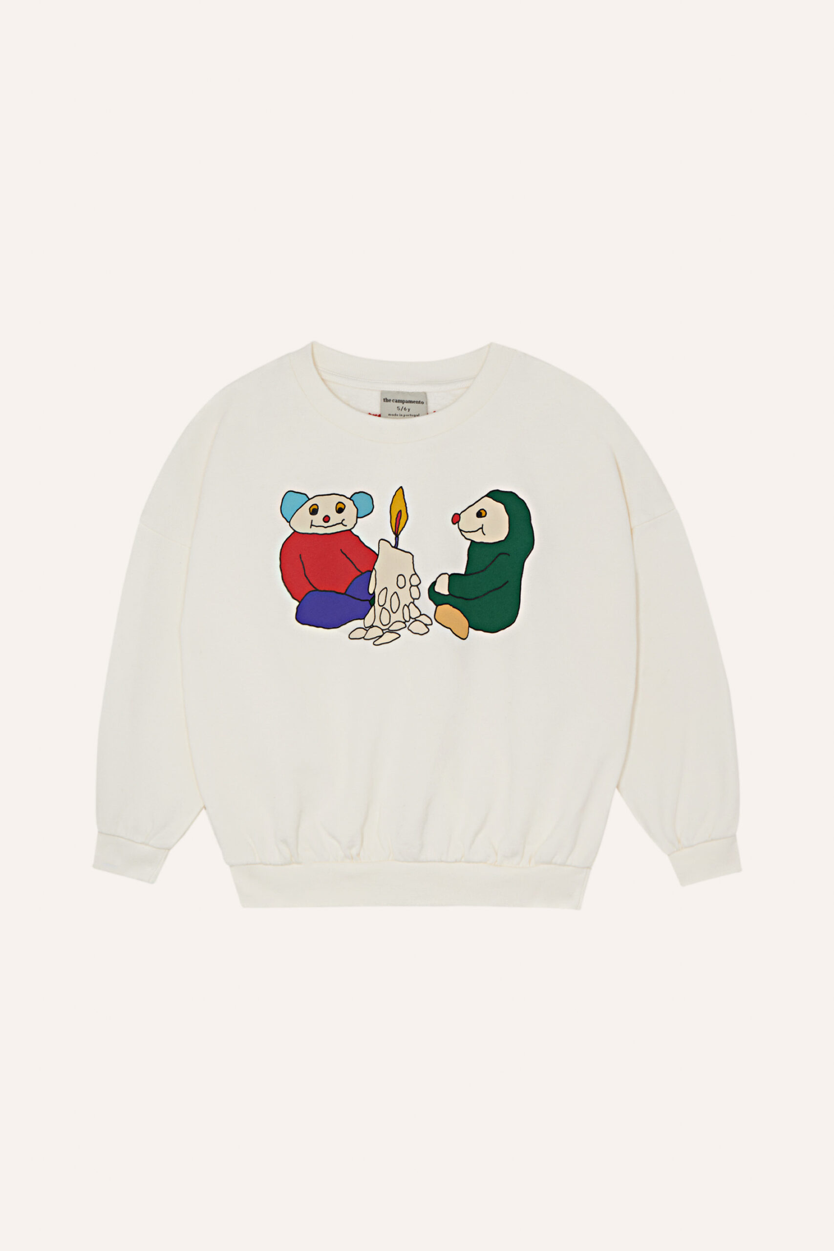 The “Campfire Friends Kids Sweatshirt” is a very comfortable garment with oversized fit. It has a print of two characters sitting around a whimsical campfire. This scene captures the warmth of being together, evoking the feeling of storytelling moments by the fire.