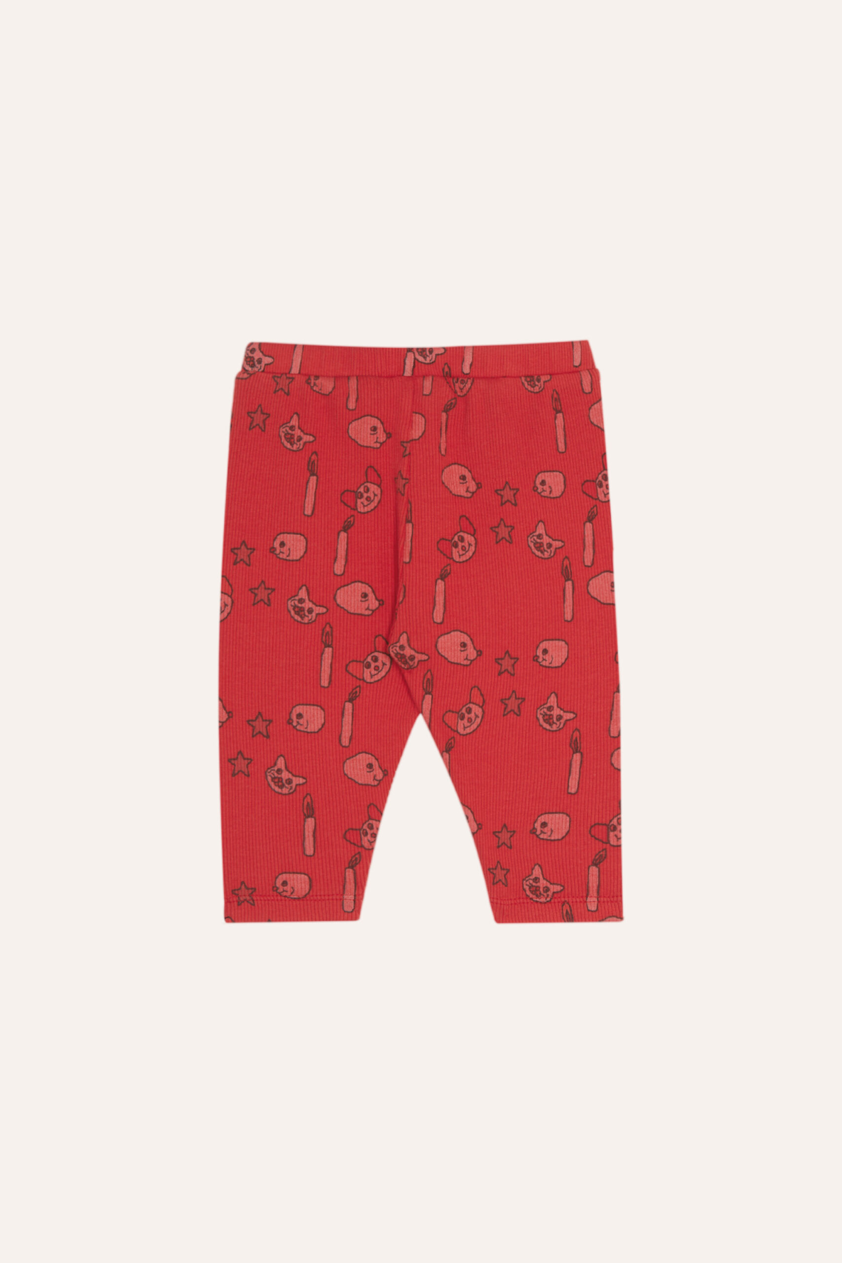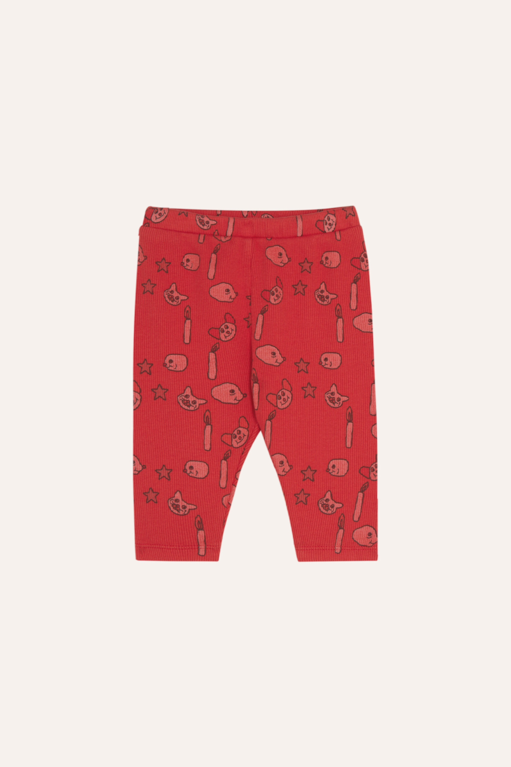 All-over print leggings with cheerful faces, stars, candles and animals.