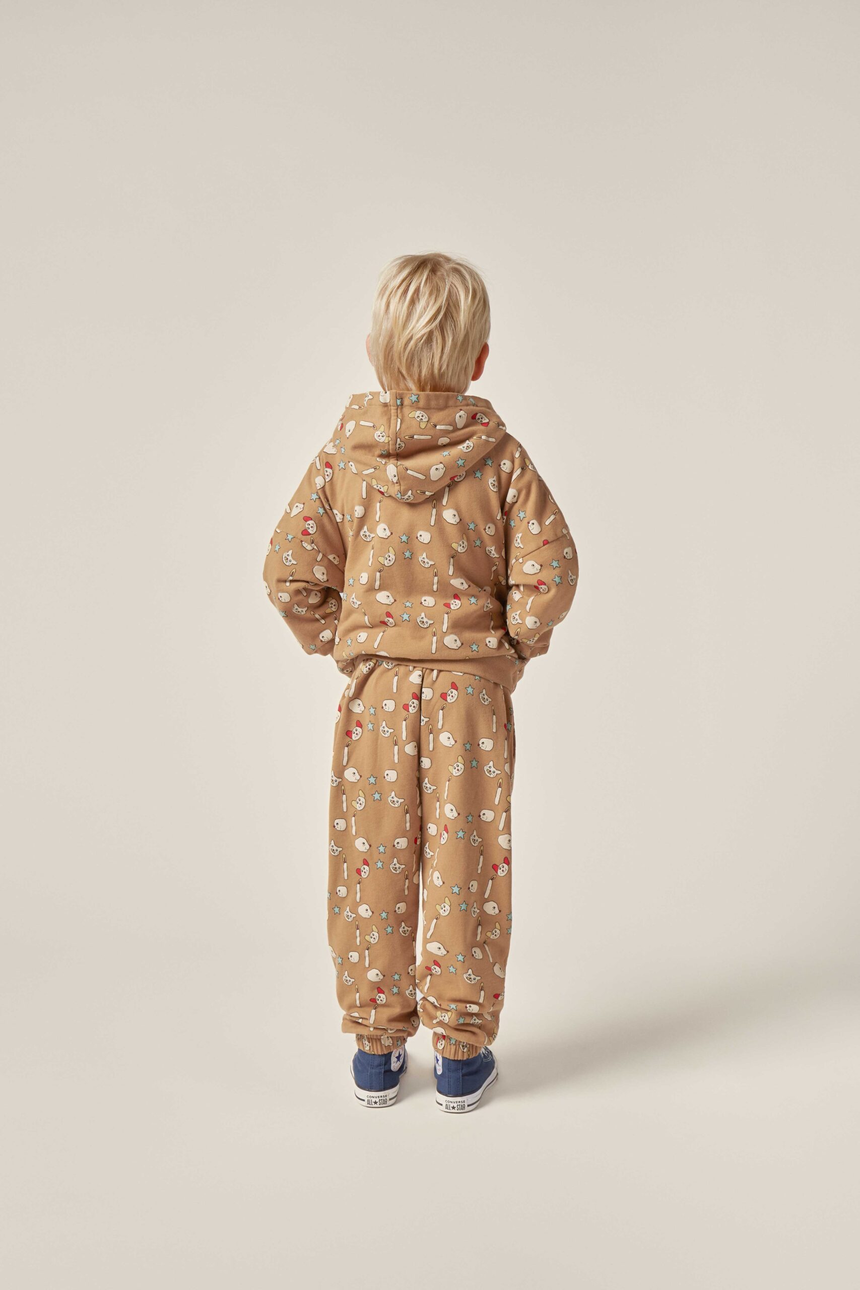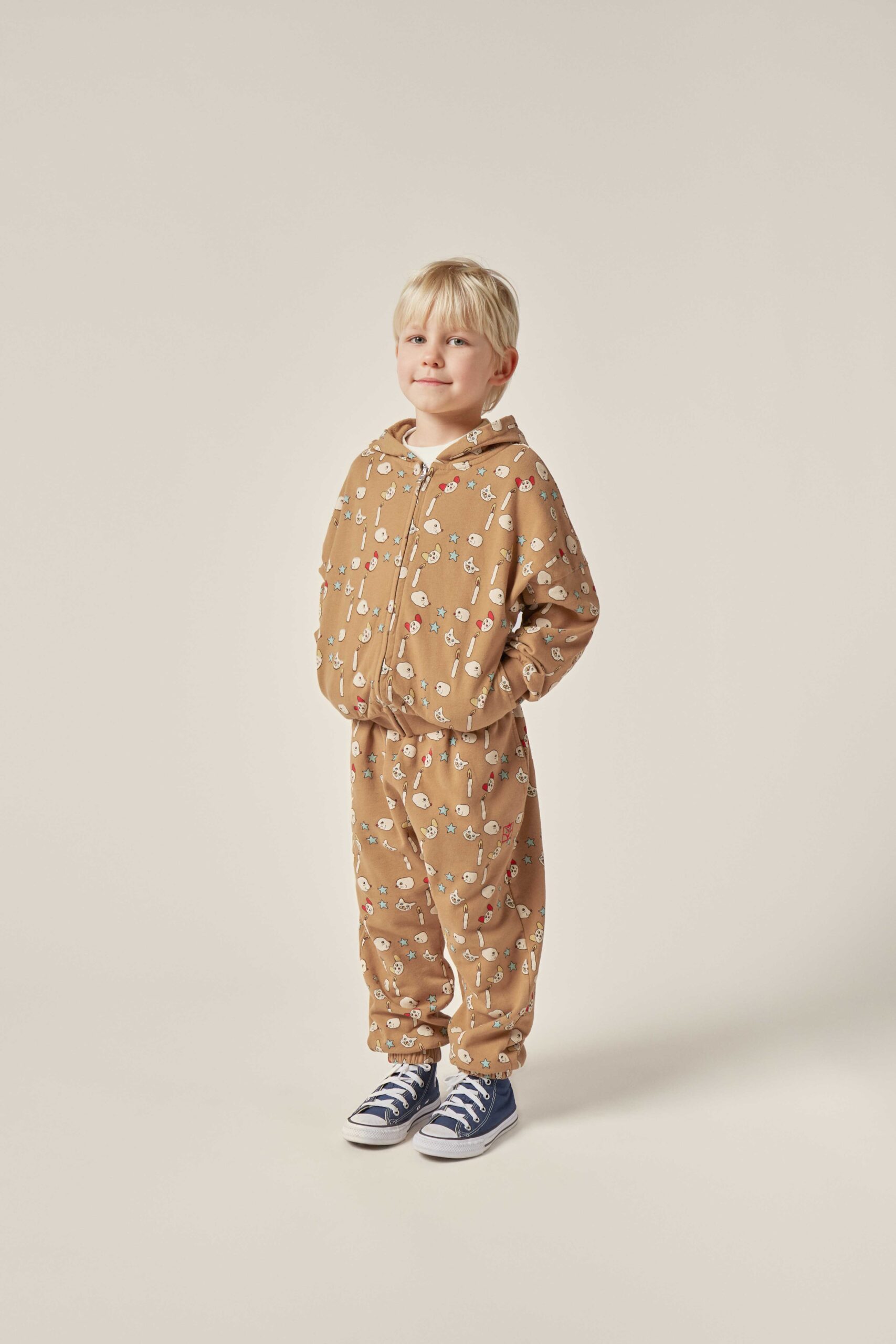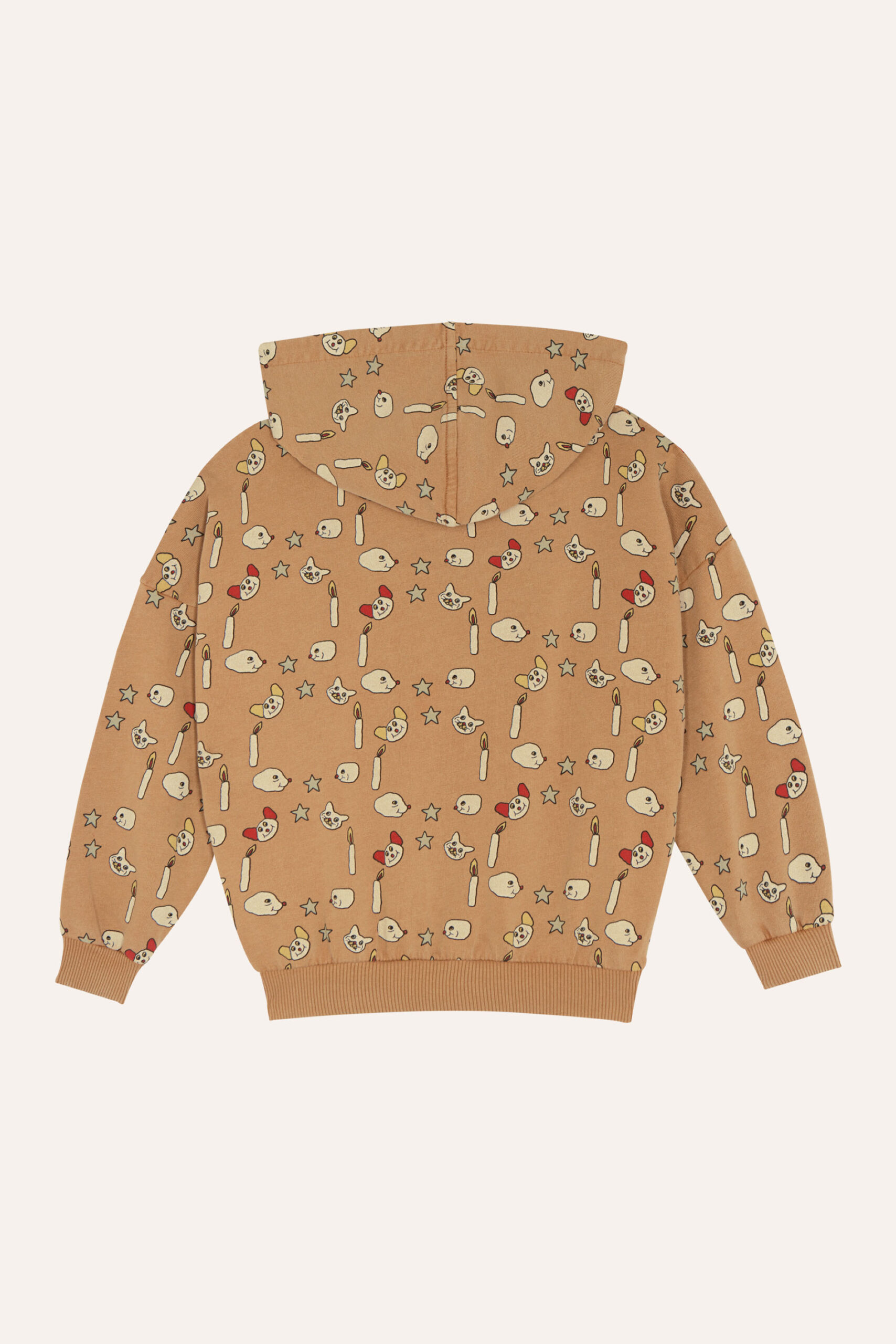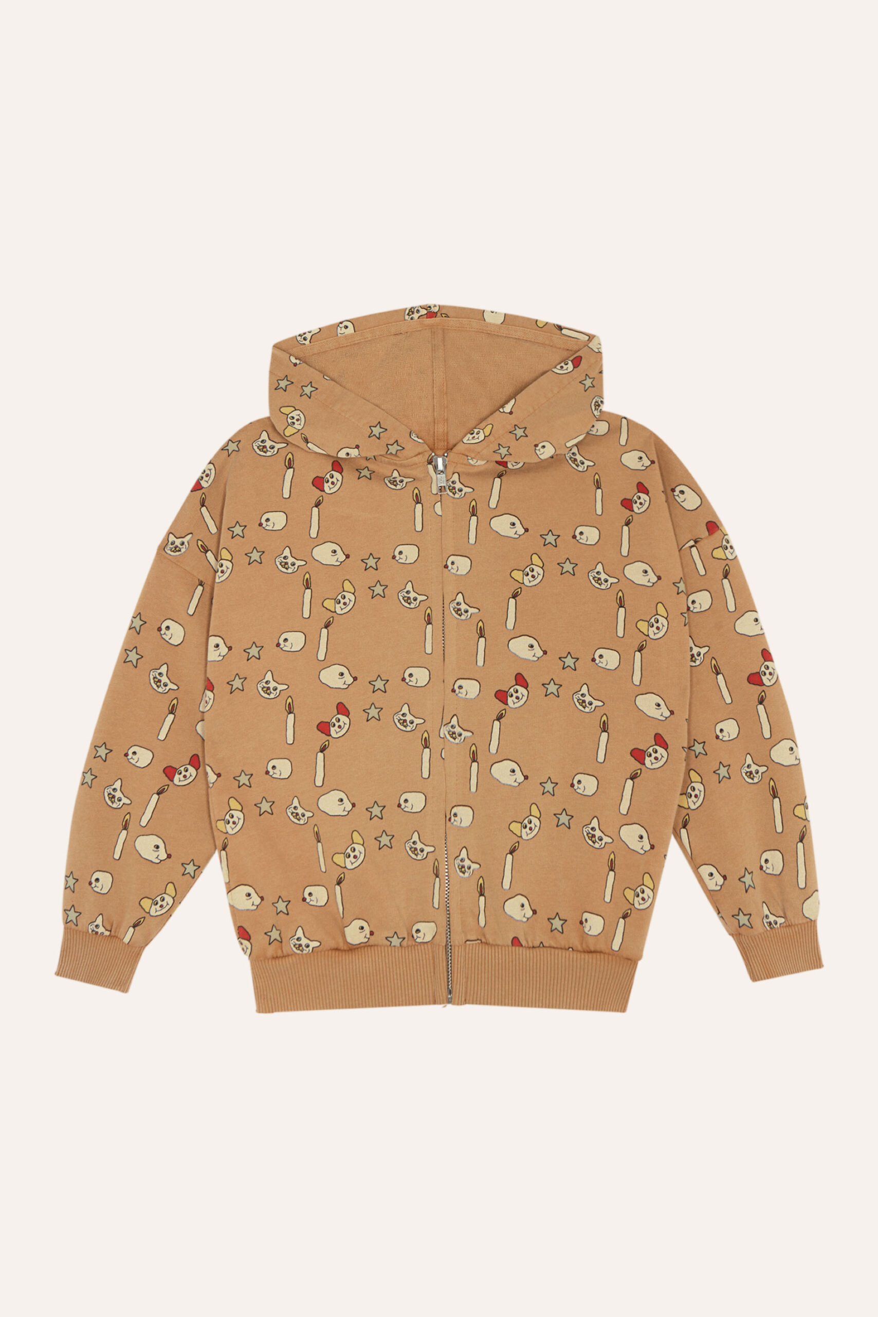All-over print sweatshirt with cheerful faces, stars, candles and animals. Long sleeves and open in the front with zip. It is the perfect garment to wear all winter.