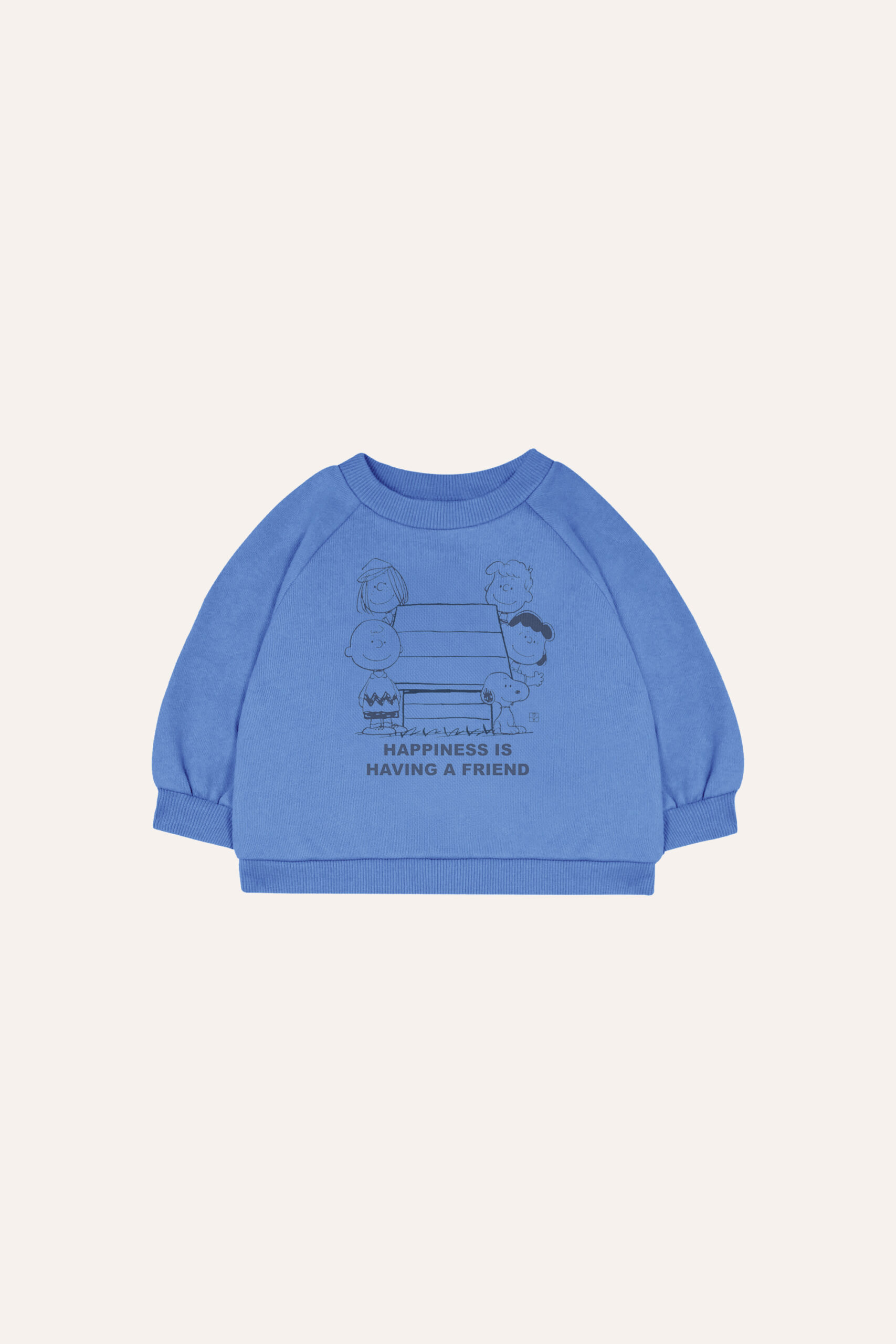 With an oversized style and made with a soft fleece quality, this sweatshirt features a print of the Peanuts group with the quote “Happiness is having a friend”. The collar is made in rib quality for more comfort.