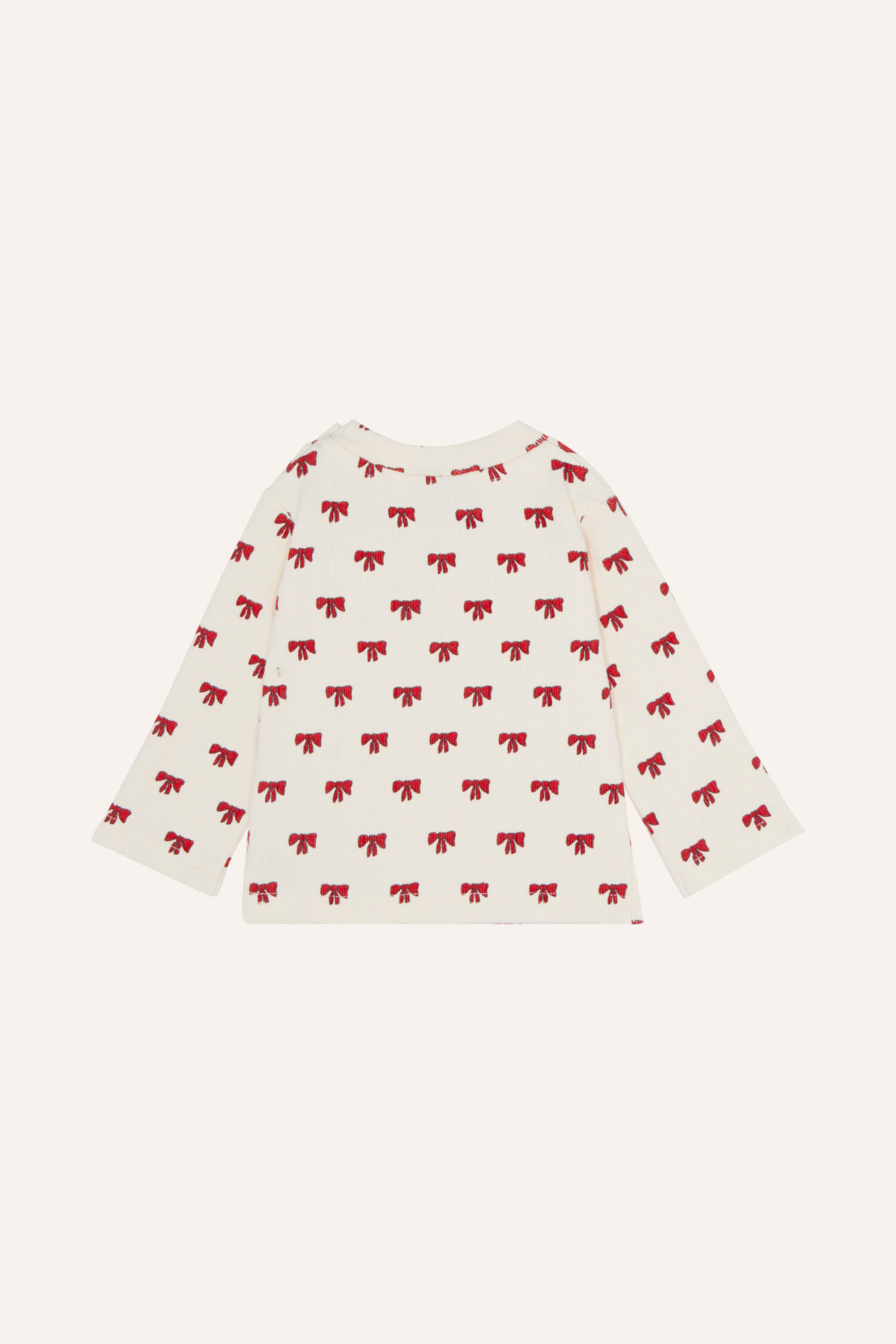 T-shirt made in a soft rib quality with a delicate print of red bows all over it. Rounded neck and long sleeves perfect for wearing all winter.