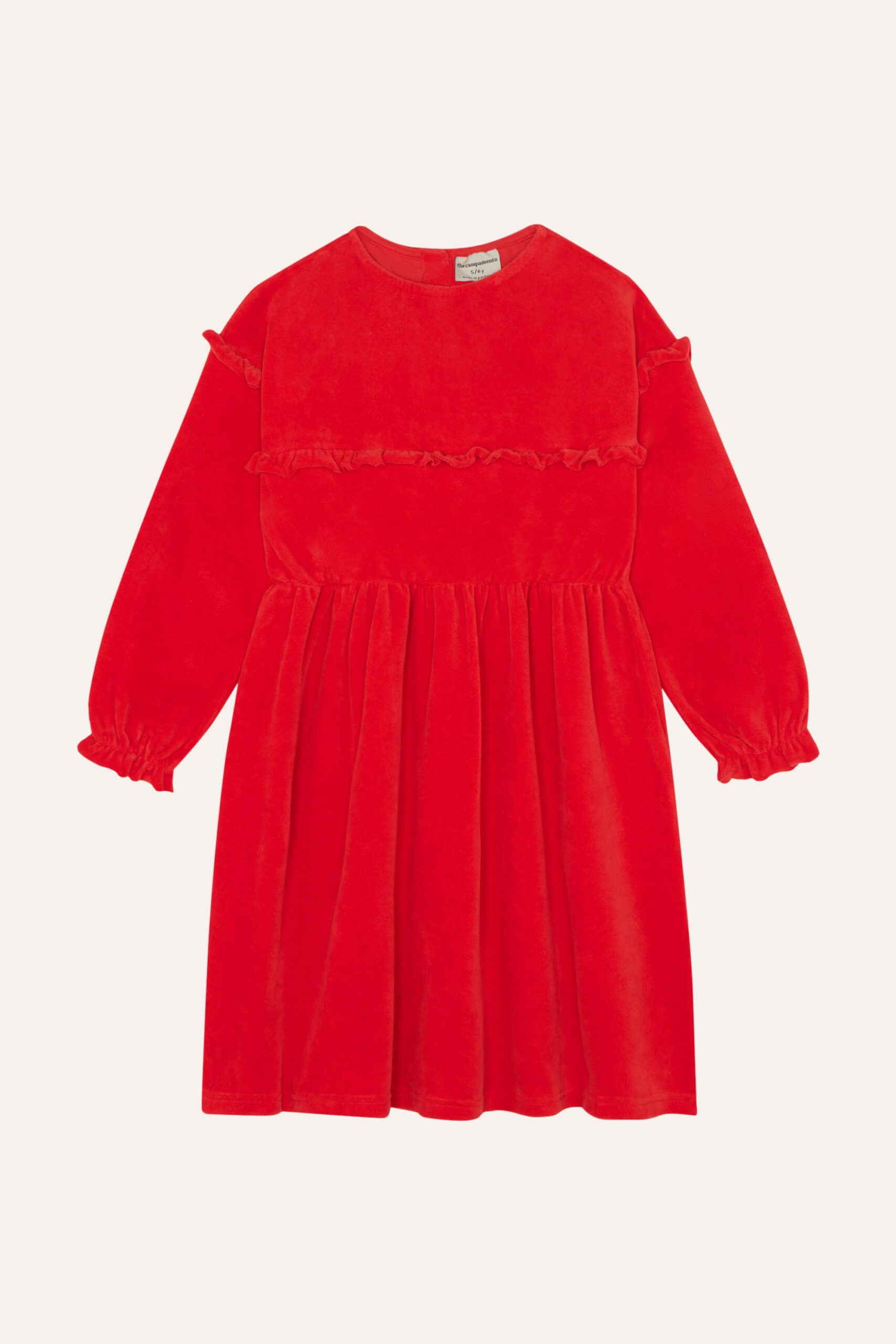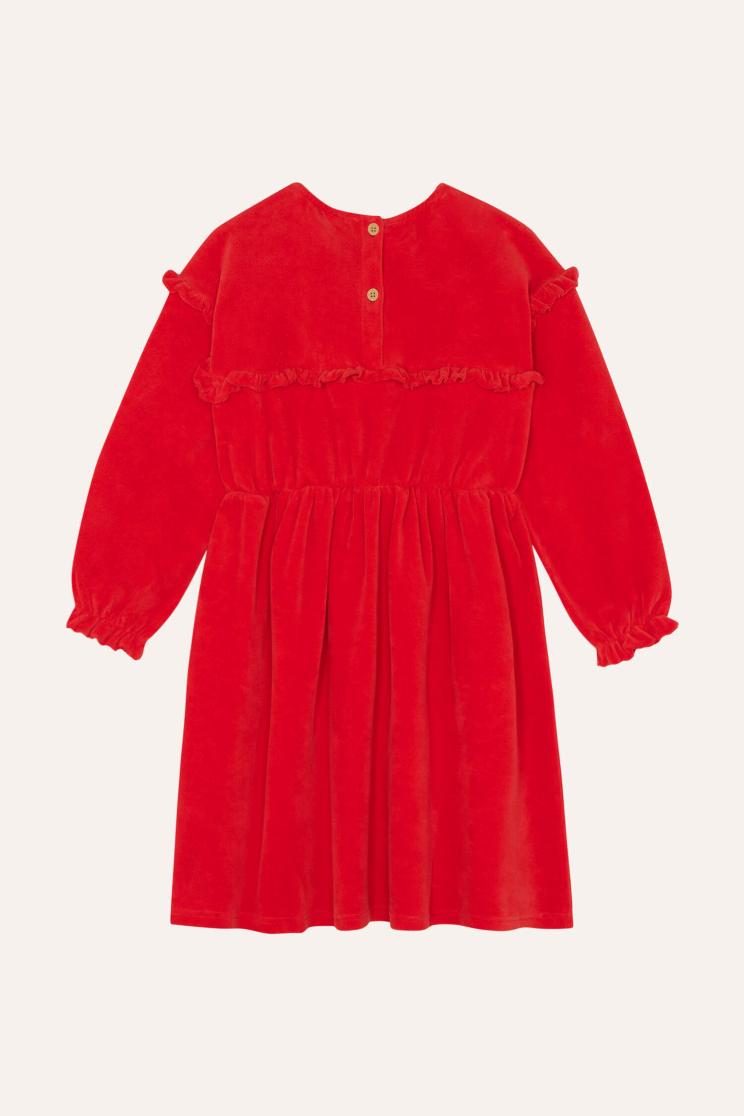 The dress they will want to wear all winter. Cool and comfortable, in a red velour fabric to give a touch of color to gray days.