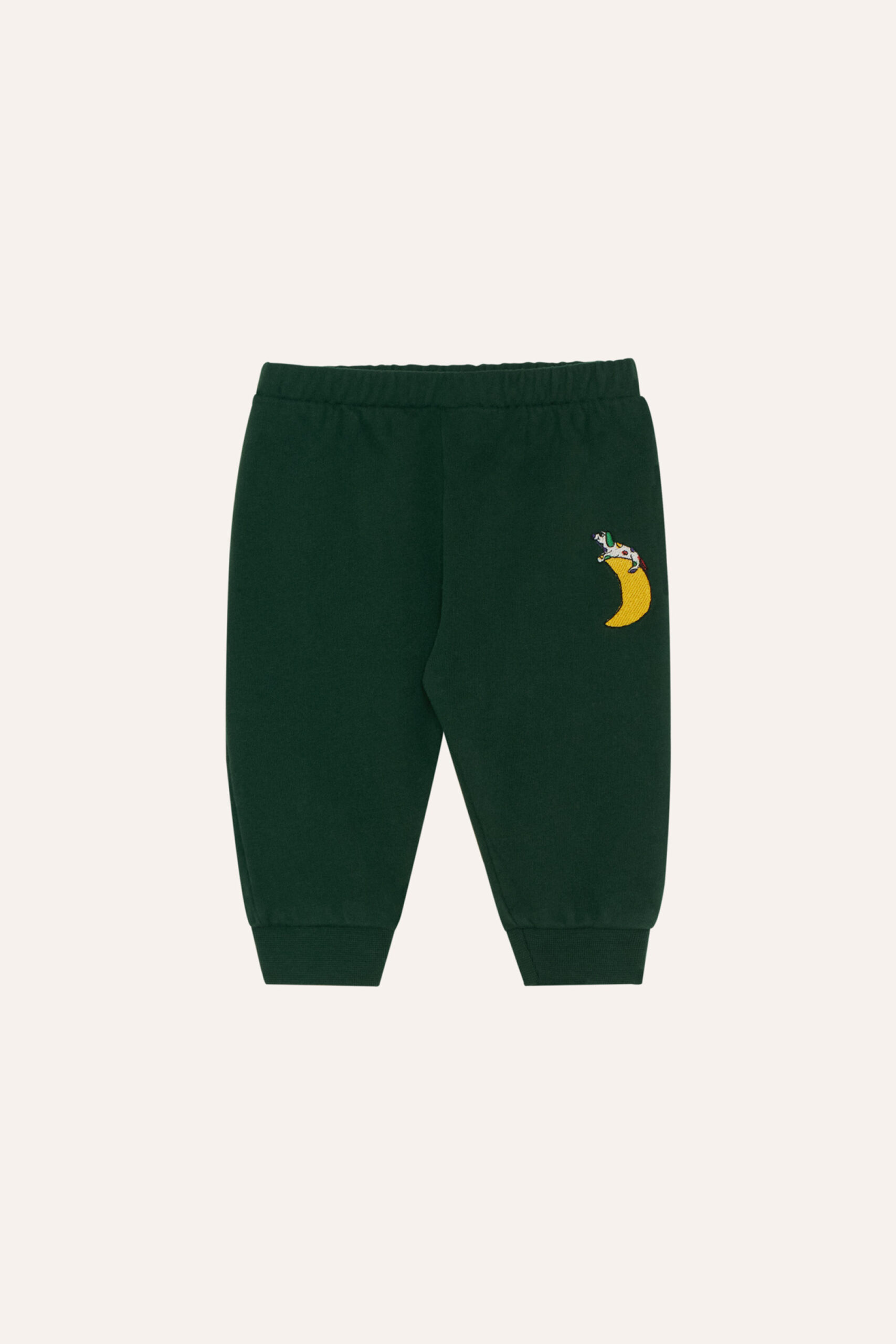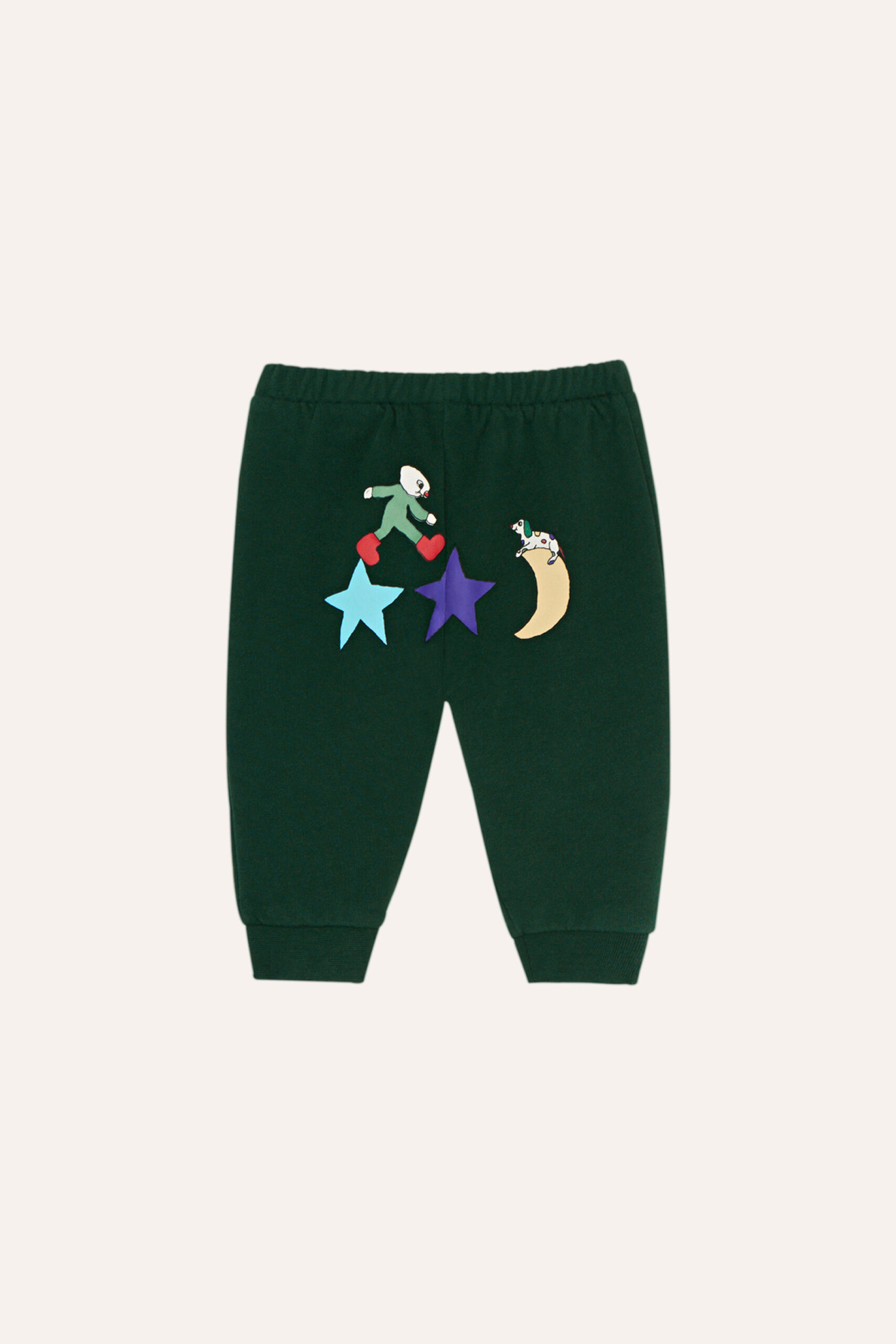 Jogging trousers in a washed fleece quality. They have a print of a character jumping over stars and the moon, accompanied by a dog. Elastic in waistband and hem for more comfort.